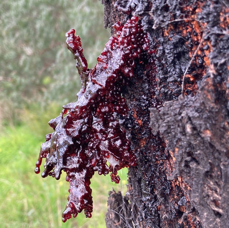 That weird angular blob is sap that’s been extruded from inside the tree. In normal times, that kind of sap is thick, heavy, like treacle or glue - it barely moves at all. But here, it must have all but flooded out from beneath the surface; the shiny surfaces are where it’s melted, the little globules are where it’s boiled. You’ll see the burn-marks just below and around the blob: a grass-fire hot enough to set the tree on fire, but not enough to hit the crown. And it’s the crown-fires - when the flames hit those oil-filled leaves, then spread out for miles in a literal rain of fire - that cause the real devastation.